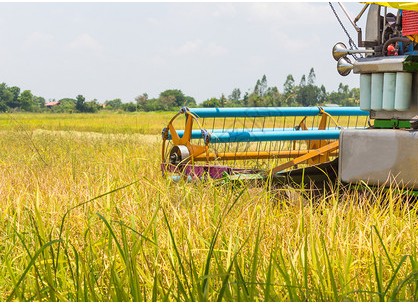 拖拉機和收割機在農(nóng)場收大米